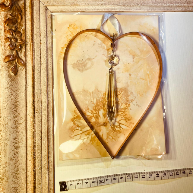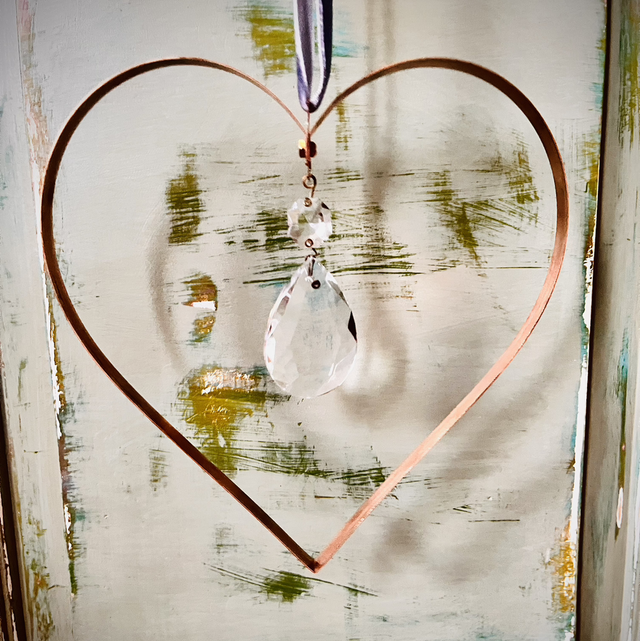 Made using reclaimed copper from old stairlifts and crystals from vintage chandeliers and beads from old jewellery . Supplied with satin ribbon