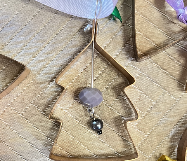 Made using reclaimed copper from old stairlifts and beads from old necklaces/light fittings/vintage chandeliers. Supplied with satin ribbon